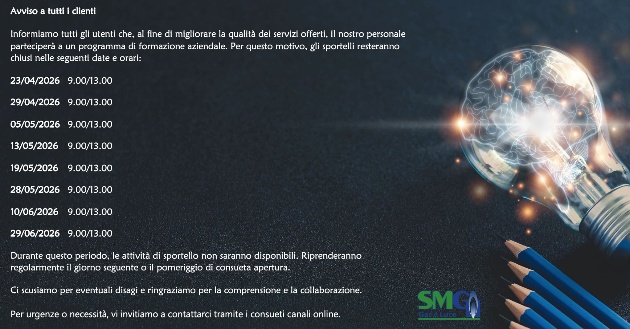 SMG è presente nel mercato libero dell’energia per assicurare ai propri clienti i servizi migliori. Gli sportelli presenti sul territorio garantiscono assistenza e attenzione a tutti i nostri clienti.